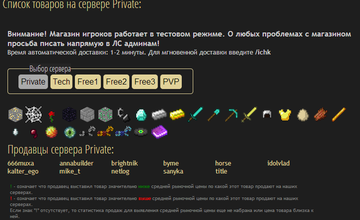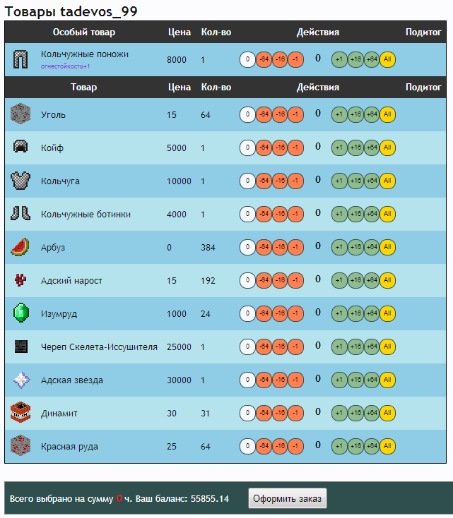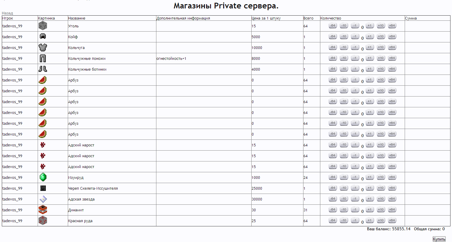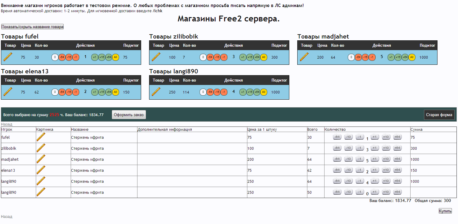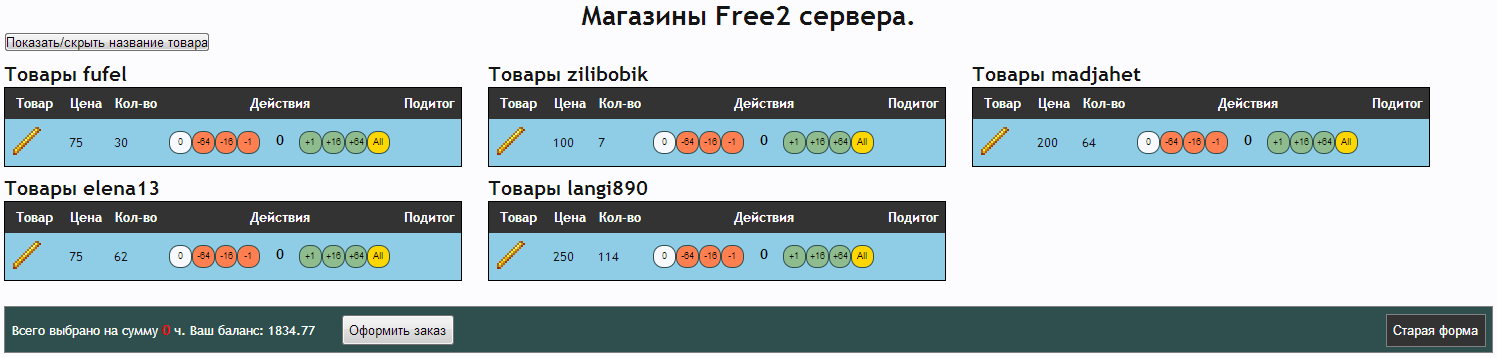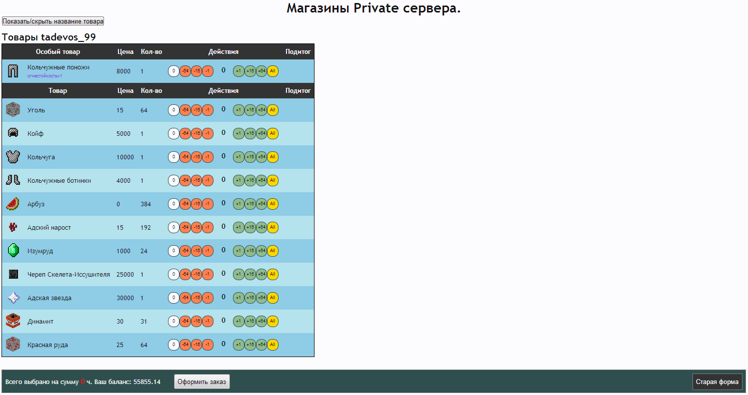 Добрый день! Поскольку все идеи по модернизации интерфейса магазина игроков так и не были реализованы, я решил сделать некоторые возможные вещи на клиентской стороне. Таким образом у меня родилось браузерное расширение для хрома, облегчающее использование текущей версии магазина. Скачать скрипт можно по этой ссылке. Установка простая: Перейдите по ссылке для автоматического скачивания скрипта Игнорируйте уведомления хрома, что расширение не может быть автоматически установлено с этого сайта Перейдите на страницу расширений (Настройки\Инструменты\Расширения) Перетащите скачанный файл в список расширений Согласитесь на то, что скрипту можно работать с вашими данными на сайте MM После этого скрипт будет автоматически работать на страницах магазина Спойлер: Инструкция в в картинках После установки интерфейс магазина будет меняться автоматически во время или после загрузки требуемых для работы данных с сайта. Рассмотрим основные изменения, которые привносит скрипт: 1. Упрощение списка товаров на сервере Без скрипта с сервера грузятся все картинки товаров, вне зависимости от того, есть ли они в продаже или нет. Поиск товаров в такой таблице, на мой взгляд, затруднял визуальный поиск нужного товара, особенно сложно было понять, продается ли стекло, например. Также, даже если сами изображения закешированы браузером, при каждой загрузке страницы происходит проверка, не изменились ли они, с помощью запроса на сервер. При большом пинге (а у меня Yota) ожидание проверки каждой картинки составлял порядка 100 мс. А товаров больше сотни. Поэтому страница магазина каждый раз грузится секунд по 10. Со скриптом загрузка картинок всех товаров, которые не находятся в продаже сразу же прекращается, как только скрипт инициализируется. Таким образом, страница списка товаров открывается гораздо быстрей. Также вместо табличной формы все товары отображаются линейным списком, что гораздо компактней и упрощает поиск нужного товара. Порядок товаров такой же, как в таблице. Спойлер: пример 2. Изменение интерфейса покупки. Группировка товаров. Без скрипта таблица товаров на больших мониторах представляет печальное зрелище. Спойлер: магазин без скрипта Таблица товаров очень широкая, много места и мало информации. Со скриптом информация отображается более компактно Спойлер: со скриптом Также самые важные изменения: Сделана группировка товаров одного пользователя и одной цены. Если у пользователя А есть 100500 стаков булыги - вам не нужно будет больше кликать по разным предложениям. Особенно это раздражало, когда там не цельные стаки (а оригинальные кнопки не дают выбрать 63 и 64 предметов) Добавлены кнопки "купить все" и "купить ничего" для каждого предложения. Это актуально в свете первого изменения (если вы хотите купить всю булыгу по цене 1 - просто жмите "All"). Особые предложения (товары с непустым дополнительным описанием) не группируются. Это сделано для того, что зачарованные предметы не путались с обычными (хотя они обычно и так не путаются из-за цены, но все равно). Название товара автоматически скрывается, если нет ни одного особого товара Скрипт работает напрямую с оригинальной формой. Для проверки вы можете нажать кнопку "старая форма" и убедиться, что скрипт раскидал ваше желание купить 4 стака арбузов на правильные предложения. В старой форме не об