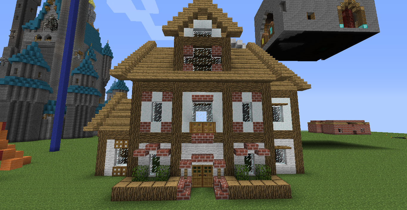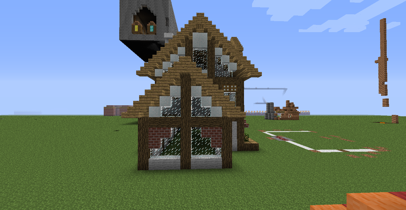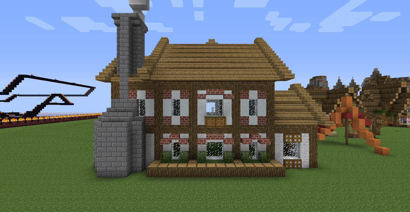 Красивый дом, я могу его построить, но мне нужно больше скринов, например боковых от входа стен, скрин чердака в профиль и второй этаж с более верхней точки "под крышей не видно что там". И да, внутри ещё надо, не на травке же спать