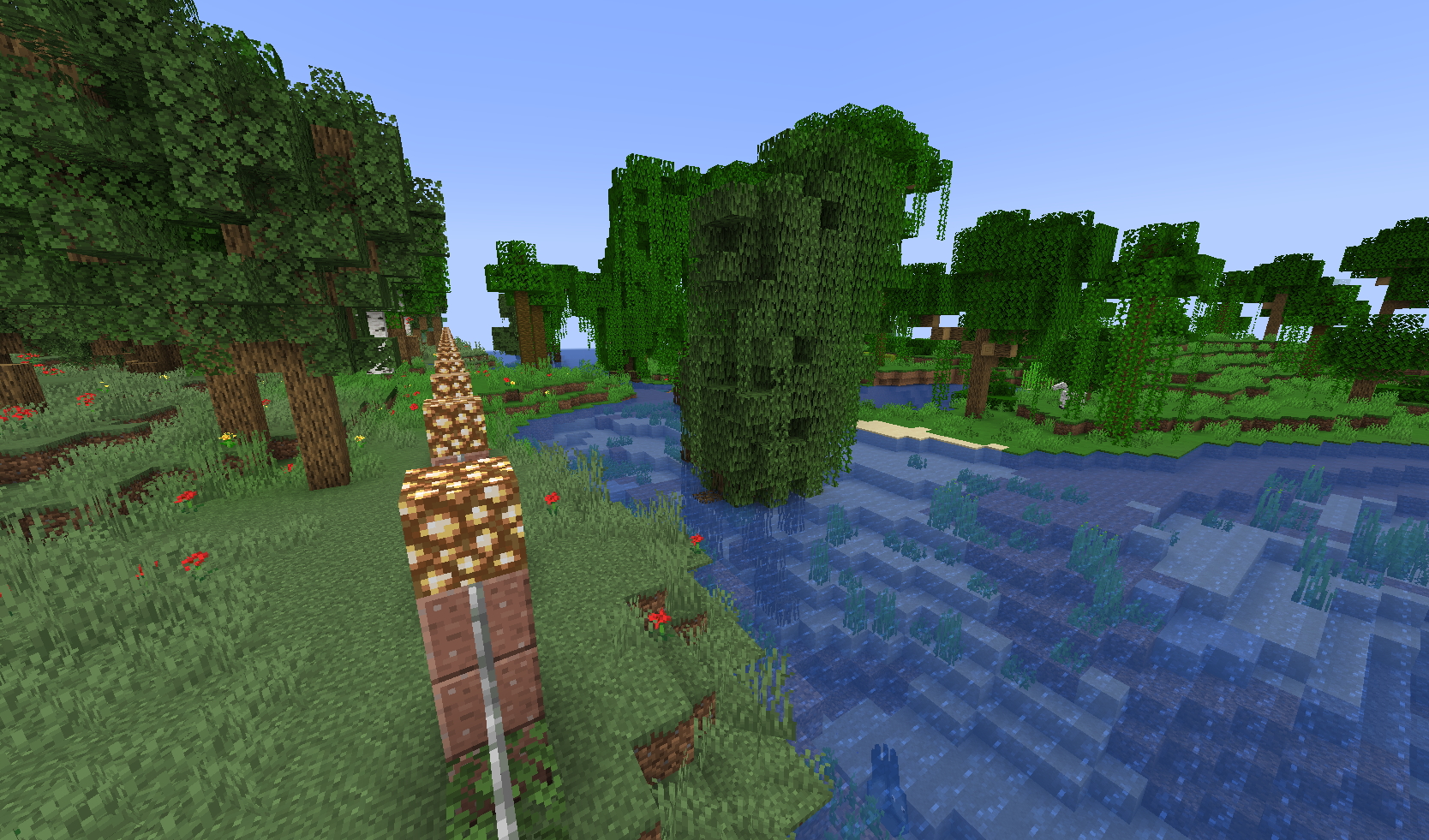 Сегодня обзор .. Манговые болота .. Это естественно мангровые деревья у которых большие мангровые корни . на деревьях есть мангровые отростки . Но это только на первый взгляд . Там есть ещё не мало вкусного ! Грязь . Генерируется в качестве основной поверхности в мангровых болотах. Толщина грязевых слоёв составляет 3 блока. Можно добыть её в домашних условиях - блок земли и колба воды Из грязи добываем Глину ) Плотная грязь - можно скрафтить . Грязь и пшеница Из плотной грязи получаем саманные кирпичи Из кирпичей крафтим саманные ступени и полублоки Вот так они симпатично выглядят Теперь о добыче ростков мангрового дерева Можно насобирать и в мангровом лесу . Но можно и проще . Нужна мангровая листва и костная мука Попробовал сделать Автоферму ростков - всё вроде просто а вот редстоун схема довольно сложной оказалась . Так что ручками гораздо проще Мангровые Корни . Это очень интересный блок В этот блок можно налить из ведра воду и вода из него не вытекает . Можно использовать как воду для заполнения бутылок А можно сделать очень красивую декорацию Тут уж кто на что горазд! )))