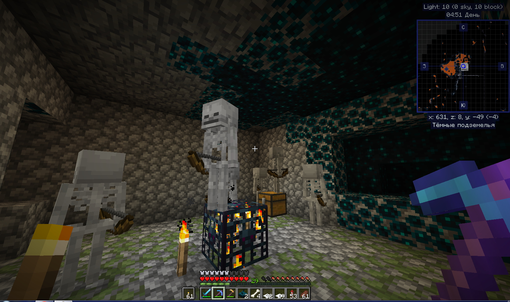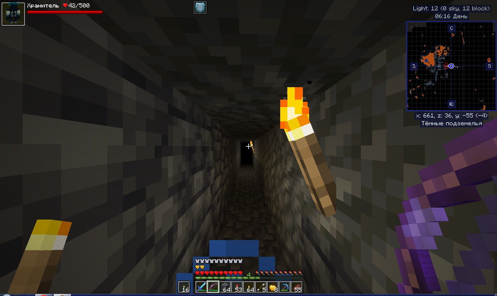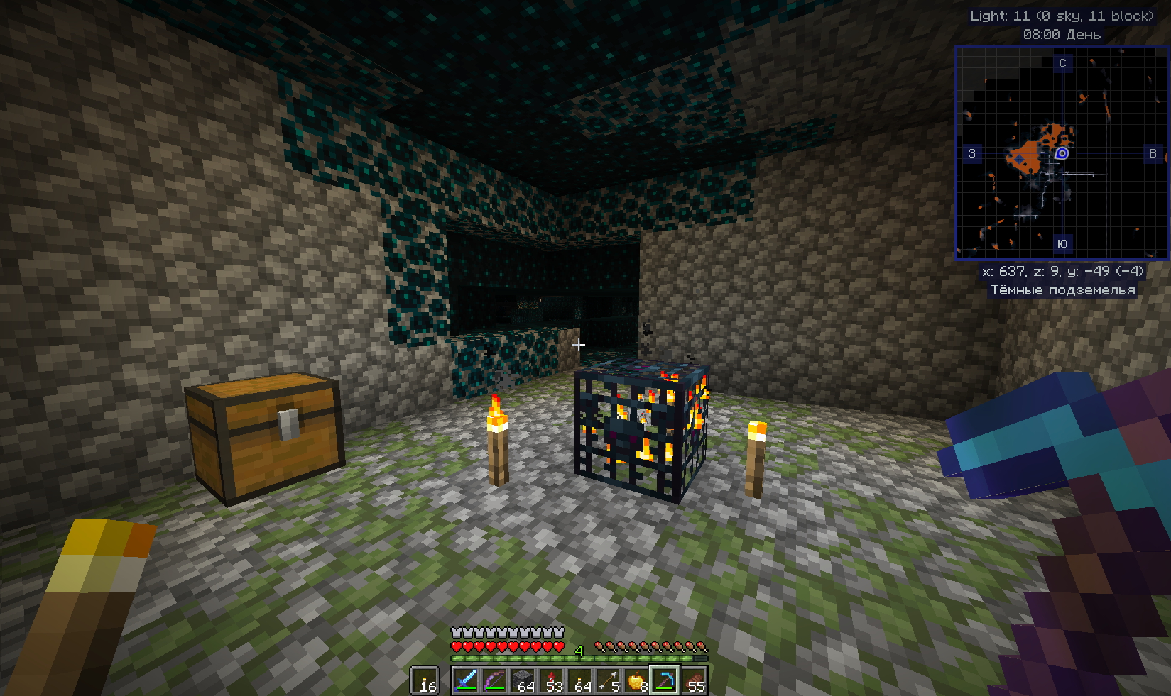 Вот покопал немного и набрёл в тёмных подземельях на Вардена Это такой слепой моб у которого 500 единиц здоровья . И убивает в ближнем бою с 1 удара - Броня не спасает . Да и реагирует он на Ваше приближение ( шерстяные коврики тоже ему не помеха - он чует Вас ) ! Ну вот задело самолюбие . Как так надо же победить злодея . Начались поиски как к нему подобраться. Начал бродить по округе . И вот нечаянно наткнулся на спавнер скелетов - вот такого я не видал ещё. Стоят скелетики зачарованные и не двигаются ! Покрутился возле этого представления и пошёл дальше искать способы победы Да вот ещё фишка . В интернете пишут что можно Голема сделать и при его помощи убить Вардена . Как всегда Это не правда ! Не получается сделать Голема если близко Варден . Пошёл другим путём . Сделал ловушку то есть яму . Обложил шерстью и прокопал туннельчик 2 блока на 1 длиной ну блоков 30 Заманил я это монстра в ловушку и из лука его нагло расстрелял . На таком растоянии Варден ничего не может сделать Потом пошёл поглядеть на спавнер . Но там уже скелеты куда то исчезли Пошёл как большой по пещере гулять но не тут то было - появился новый Хранитель . Так что смысла убивать Вардена просто нет. Но кое что наковырял : Скалка . скалковой жилы . скалкового катализатора . скалк-сенсоров. Потом поэкспериментировал уже дома с выращиванием скалка . - всё вроде получилось Единственное что пока не получилось добыть в домашних условиях это скалкового крикуна .