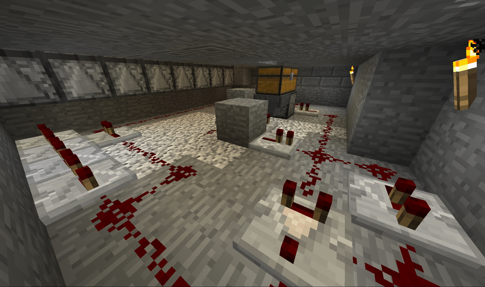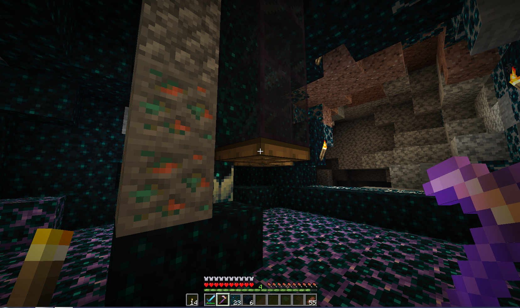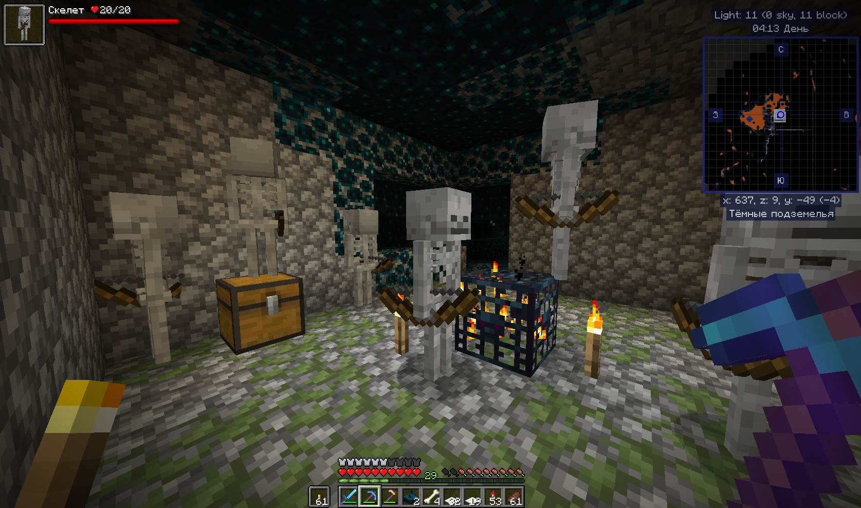 Вот покопал немного и набрёл в тёмных подземельях на Вардена Это такой слепой моб у которого 500 единиц здоровья . И убивает в ближнем бою с 1 удара - Броня не спасает . Да и реагирует он на Ваше приближение ( шерстяные коврики тоже ему не помеха - он чует Вас ) ! Ну вот задело самолюбие . Как так надо же победить злодея . Начались поиски как к нему подобраться. Начал бродить по округе . И вот нечаянно наткнулся на спавнер скелетов - вот такого я не видал ещё. Стоят скелетики зачарованные и не двигаются ! Покрутился возле этого представления и пошёл дальше искать способы победы Да вот ещё фишка . В интернете пишут что можно Голема сделать и при его помощи убить Вардена . Как всегда Это не правда ! Не получается сделать Голема если близко Варден . Пошёл другим путём . Сделал ловушку то есть яму . Обложил шерстью и прокопал туннельчик 2 блока на 1 длиной ну блоков 30 Заманил я это монстра в ловушку и из лука его нагло расстрелял . На таком растоянии Варден ничего не может сделать Потом пошёл поглядеть на спавнер . Но там уже скелеты куда то исчезли Пошёл как большой по пещере гулять но не тут то было - появился новый Хранитель . Так что смысла убивать Вардена просто нет. Но кое что наковырял : Скалка . скалковой жилы . скалкового катализатора . скалк-сенсоров. Потом поэкспериментировал уже дома с выращиванием скалка . - всё вроде получилось Единственное что пока не получилось добыть в домашних условиях это скалкового крикуна .