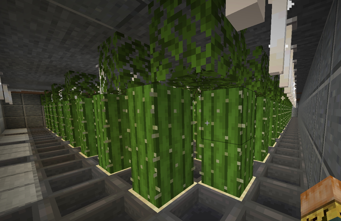 Подожди, но у тебя же кактусята плавятся на чистом бамбуке. Т.е. ты не крутишь из бамбука доски. Я считаю это расточительством и отсутствием энергоэффективности! Да, ресурс бесконечный, растет сам по себе. Даёшь переделку в скручивании из бамбука блоков, из блоки доски... Повышаем КПД, экономим пространство и ресурсы!