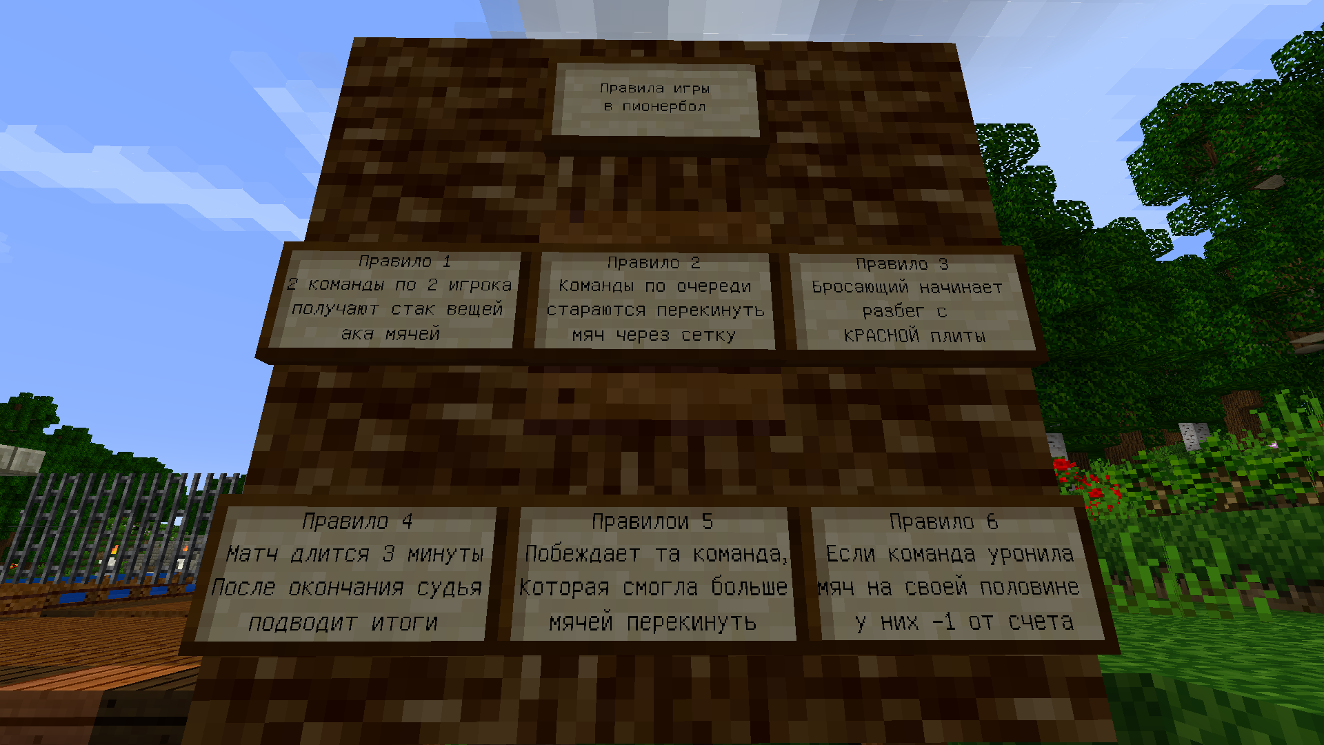 Построила площадку для пионербола Правила следующие (пока тестовые, потом может быть что-то добавим) Судья будет внимательно следить За игрой команд Задача нашему Паразитскому эвентеру - протестировать и доложить о впечатлениях Нужно понять по высоте сетки - достаточная или стоит как-то поднять Время матча пока 3 минуты. Нужно оценить сколько бросков может сделать каждый игрок за это время. Подумать над возможностями игры 1 на 1, 3 на 3 (время матча, количество "мячей") Зелья надо запрещать (то есть ни пьяным нельзя, ни тем более под зельем прыгучести) и предупреждать об это отдельно Подумать над возможностью разрешить игрокам второй команды пытаться поймать "мяч", когда первая кидает. То есть если предмет попал в инвентарь игрока, то считается что "мяч" отбит, например. Это во-первых обеспечит, что никто не будет статично стоять, и во-вторых, нельзя будет приблатыкаться чтобы постоянно кидать мяч через сетку в одну и ту же точку