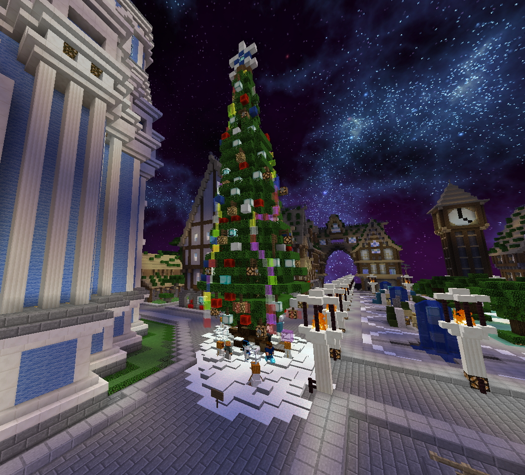 В центре у нас фонтан. А елка около трактира получилась. Вполне норм