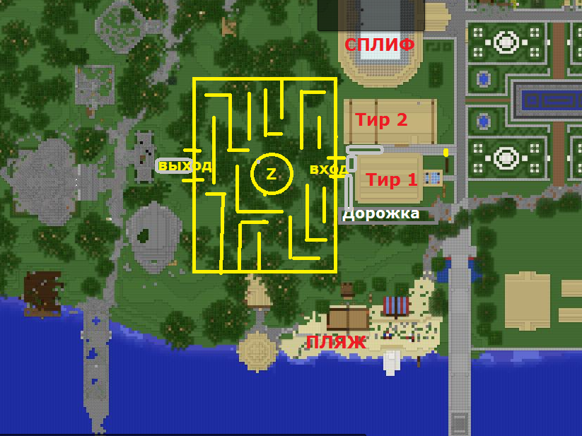 Я тебе что, Архитектор чтоль? Внимание ! Требует обсуждения/утверждения ! Для начала погугли: "Лабиринт майнкрафт" - увидишь 100500 фото и школо-туториалов - уже придут какие-нить идеи. Ширину прохода делай в 1 блок, высоту стен 3-4 блока с эффектом развалин (полублоки), используй лианы и замшелые камни всех видов (булыгу/кирпичи). "Витиеватость" Лабиринта - на твоё усмотрение - включи фантазию (но чтобы выход всё таки можно было найти))). Листву сверху не убирай (оставь "летающие шапки") - чтобы с динамической карты нельзя было найти выход и зомби днём не сгорали. В центре Лабиринта оставь место для выхода зомбаков из лифта - какую-нить "будку" им придумай.) Для начала выровняй территорию, выше четвертого блока от земли ничего не убирая. Разметь границы Лабиринта и построй наружные стены (не обязательно правильной геометрической формы - можно и овал, круг и ещё какой-нить "октаэндр" - смотри по ландшафту и аккуратно впиши Лабиринт в уже существующие постройки. "Ацкий треш" начнётся с наполнением/возведением внутренних стенок Лабиринта - тут придётся по 100500 раз ломать/строить/планировать. По окончании проведи дорожки ко входу и выходу. С лифтом от спавнера Зомби до центра Лабиринта Джек поможет (он бо-о-ольшой спец), на всех остальных работах используй ЛЮБУЮ свободную "Паразитскую" рабсилу. P.S. Рядом со спавнером зомби есть ещё и паучий (но им нужно лифт 2х2 блока) - было бы не плохо и их поднять наружу. (больше кирпичей от игроков для стройки соберём )))).
