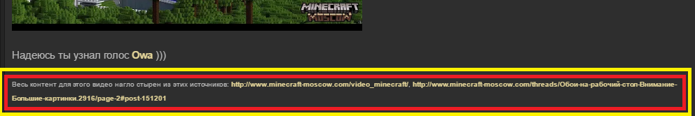 Только ты не там оставил ссылки на оригинальный контент. Имелось ввиду на ютуб канале на который ты залил видео. Внизу в описание оставить надо было ссыль на оригиналы из которых ты сделал ролик. То что ты на ММ кинул ссылки в посте на сайте ММ - это и так понятно. Они тут скорее носят характер откуда ты взял наработки. А вот на Ютубе не понятненько откуда ты взял. Да и в целом, когда юзаешь чьи-то наработки, оставлять ссылки в описании на оригиналы - это хорошая практика, ну по крайней мере правильная.