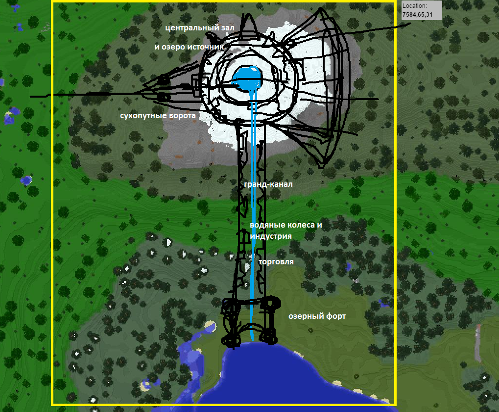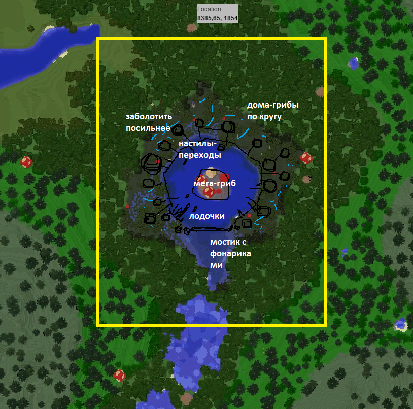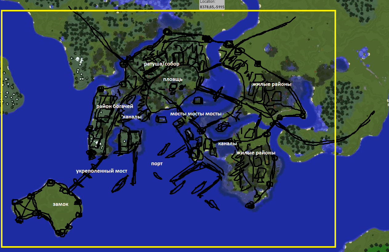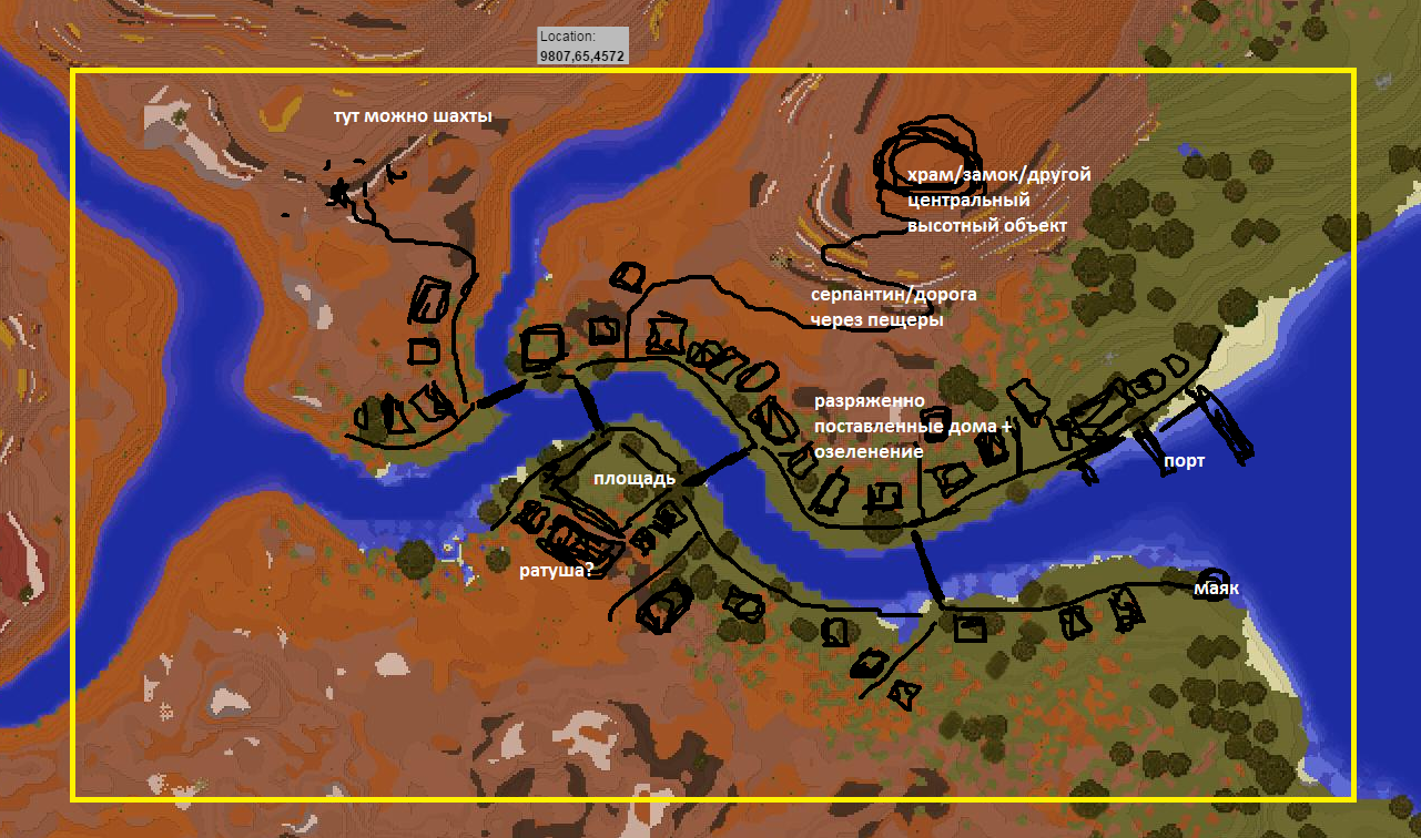 Ага! Испугались, что вы следующие? Расслабьтесь. Это будет специальный новогодний выпуск, где я не буду никого расстраивать своей беспощадной (но всегда справедливой) критикой. Лишь выступлю с ценнейшим мастер-классом. Все знают, что наша новая карта (http://81.88.215.231:8123/) расширилась на восток и обзавелось огромным количеством вкуссснеееейших мест для большого и толкового строительства после переноса. Я подготовил для вас 7 (в конце концов наступает 2017 год) набросков для новых кусков карты, идеи сочетания местности и потенциального строительного наполнения. Формат простой. Желтая рамка предполагает сколько территории надо будет захапать (но на все мера конкретной совести). Черным набросаны (грубо) примерно очертания и мысли, белым подписаны критические места (тоже грубо, в целом). Так же указаны примерные координаты, где найти заветное местечко. 1 Это идеально место для "классического", но бессмертного формата, о котором мечтает каждый потаенный лорд или леди с минимальной жаждой власти и архитектурного величия -- свой замок, город и некоторый разерв окрестностей с фермочками и прочими атрибутами медиевальной жизни. Место хорошо своей реалистичность (локальной и стратегической, если вам интересен условный лор мира), гармоничностью и возможностью хорошо локализовать территориальные резервы, к которым будет трудно пристроиться коробко-варварам. 2 Тут немного экзотики. Очень интересное, панорамное место, где сливаются вытекающие из каньонов реки и стремятся во внутреннее юго-восточное море. Укрепления здесь делать сложно, да и в целом бесмысленно, поэтому я выбрал формат более мирной, широко раскинувшийся деревни/городка. Крепость (или какой-то сложнодоступный храм) можно, впрочем, сделать. Здесь ключ к успеху, как я вижу, сделать красивые дома, мостики и грамотно озеленить, чтобы долина сладко резонировала с жаркими камнями мезы. 3 Здесь праздник фентези, блекджека, гномиков, фей и смертельных доз милоты. Идея в том, чтобы сделать на болотце супер-кавайную деревеньку, где все живут в домах из грибов, ходят по милейшим мостикам, а по ночам их размеренную жизнь освещают подвешенные повсюду еще более милые фонарики (в идеале надо раздобыть морских). И конечно же там всех угощают чаем и конфетами. Идеальный проект для девочки, если, конечно, боги кубов ниспослали ей творческих сил. 4 ООООО! Если бы я только не был навсегда скован и проклят Меровией, то САМ бы немедленно начал работать над этим проектом. Фентезийная Венеция, стоящая на проливе... на таком классном стратегическом месте. Такое безупречно подходящее болото и устья рек! Бесконечный потенциал интересных решений, стилизация и супер-крутого внешнего вида. Проект, безусловно, потребует серьезных инвестиций времени и ресурсов (терраморф никто не отменял), а так же очень уверенной и опытной строительной руки, так как придется решать много нетривиальных задач (архитектура, композиция, бесчисленные важные детали). Есть ли в нашем мире такой герой? 5 Островок-малышок, но который может засиять в грамотных руках в 100 раз сильнее любого идиотического аэродрома до горизонта. В центр - на высоту, донжон, круглый в базе, но разросшийся красивыми башенками и выступами - по кругу стену, немного, возможно, отвоевав у моря площади (5-7 блоков), вдоль нее -- дюжина или около аккуратных домиков. Причал и кор