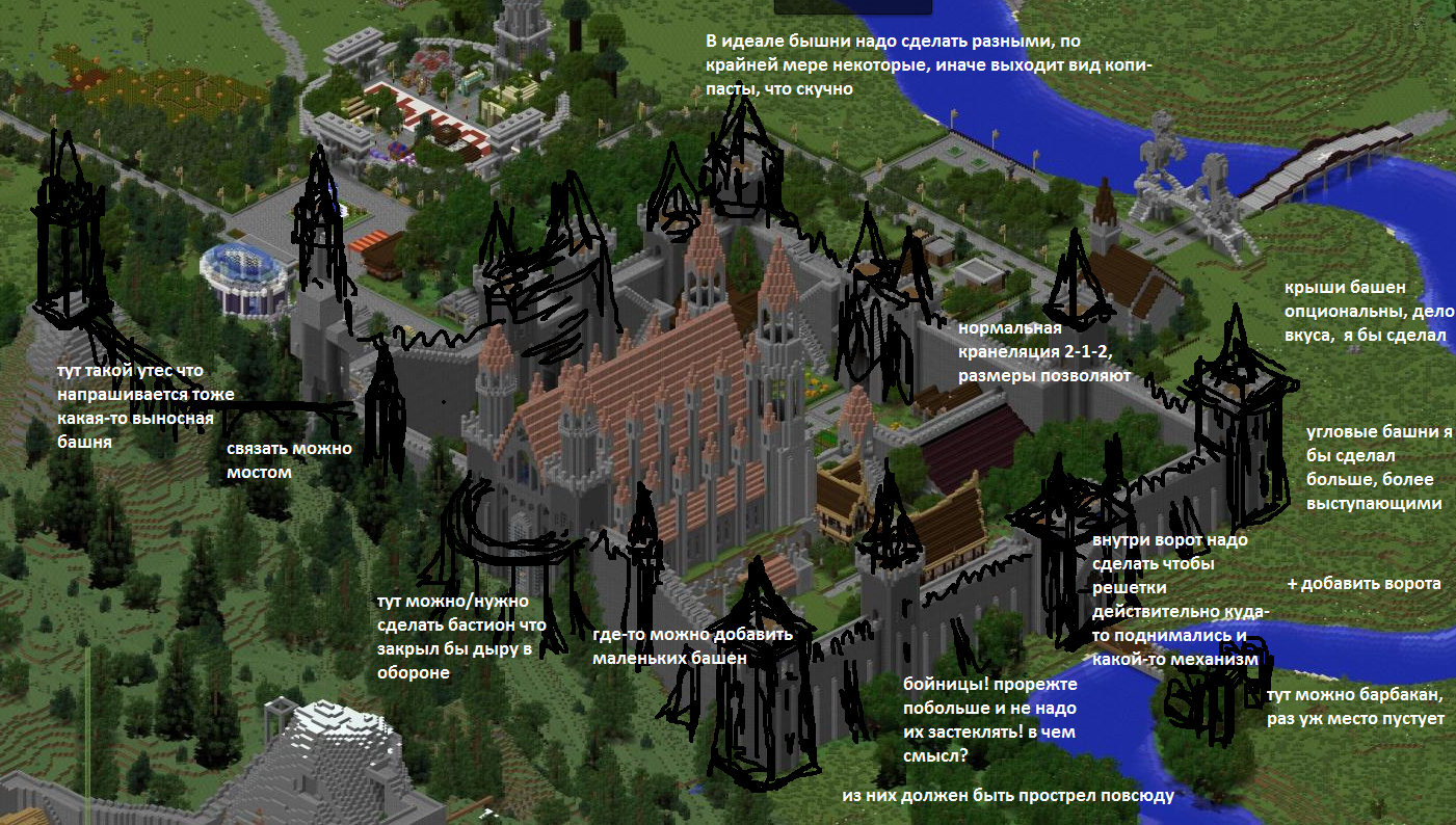 Итак. Выпуск №2 Посетим твердыню клана Dawnguard, где, по слухам, обитают некие амазонки (Kitory, Amee_J, если я ничего не перепутал), боевые сестры, защищающие нас мир от ужаса ночи -- вампиров. Ожидание... Реальность... Но обо всем по порядку! /// Путь во владения Стражи Рассвета начинается с очень длин...н...н...ного и скучного аллейного каскада, которому бы позавидовал любой создатель типичного провинциального парка культуры и отдыха на просторах бывшего СССР. Но, дело вкуса. Что-то, может быть, считает такое благоустройство милым. Бесконечную аллею разрывает на две части подозрительный мостик. Видимо тут живут в реке какие-то камнежорные бобры, совсем обточили опоры, сорванцы. Толще надо! У ворот мини-рынок, здесь торгуют и с инопланетянами -- специально для них огромная надпись на мостовой, чтобы легко было заметить с орбиты. Практический смысл понятен, но атмосферу убивает. Наконец, оказываемся у ворот... ... К вопросу укреплений мы еще вернемся. /// Внутри нас ждет все-так-же-мило озелененный замковый двор, готический собор (центр местной духовной жизни) и несколько незамысловатых построек вроде таверны, конюшни и домиков местных пизанов... Внутри таверны, кстати, даже довольно мило. Конюх уже буквально разлагается от злоупотребления самогоном... Сам собор, хотя и имеет очень "экономные" решения (многое выложено явно простенько, из цельных блоков моно-цвет, без каких-либо изысков с текстурой или геометрией), смотрится нормально. Внутри с атмосферой, не отнять. Но детали культа от меня ускользнули -- на месте алтаря стоит белоснежный трон. Над городом высится статуя Стива (или не Стива) строителя и воина. Но, со всей начинкой и внутренними постройками и бесконечными деталями разбираться дело очень долгое и неблагодарное. Пусть тут сестер хранят их боги или идеалы, возвращаемся к... УКРЕПЛЕНИЯМ! Тут, к сожалению, процветает ультра-типичный синдром. Синдром "телефона Хоттабыча". Когда воспроизводятся какие-то представления и штампы, но нет понимания зачем некоторые вещи были нужны, как работали или как состоят в взаимосвязи. Замок в нынешнем виде абсолютно бессмыслен. Зачем все эти высокие башни и стены... если враги могут просто разбить ОГРОМНОЕ окно на уровне земли и спокойно войти? Еще и тут же прихлопнуть самую главную правительницу или же там украсть священное чучело, которое там сидит по праздникам. Или может это специальная лазейка для мужчин, которым формально вход запрещен, но... форточка открывается, когда настоятельница монастыря в хорошем духе? Эх... так или иначе, каждый кто способен пережить безжалостные розги моей критики, получает и сладостную мазь исправления, если не слишком горд, чтобы ее принять. Какие бы я внес правки, не уничтожая текущий формат не уходя далеко за реальное? А вот какие... Полностью под снос ужасные ворота-конуры, из которых вот-вот выскочит advice-dog. Так же просто адская кранеляция на башнях. Исторически делали наоборот -- зубцы шире, проемы между ними уже. Потому что смысл в укрытие и безопасной позиции для огня, а не в том чтобы зубчиками торчало. Я еще видел вы пытались делать контфорсы на стенах, слишком робко. они могут быть намного массивнее. Если интересно, я могу помочь теоритической частью и подробнее. Ладно, пора заканчивать, и так уже очень много. Тут несколько мыслей в догонку. 1) Возможно владельцам раскритикованного вс