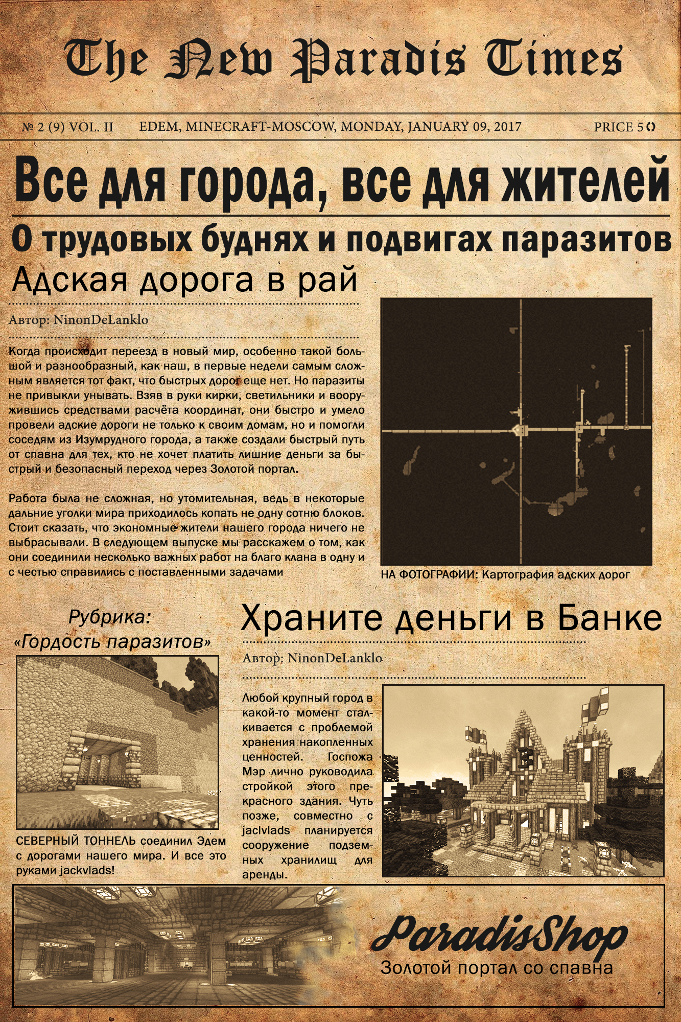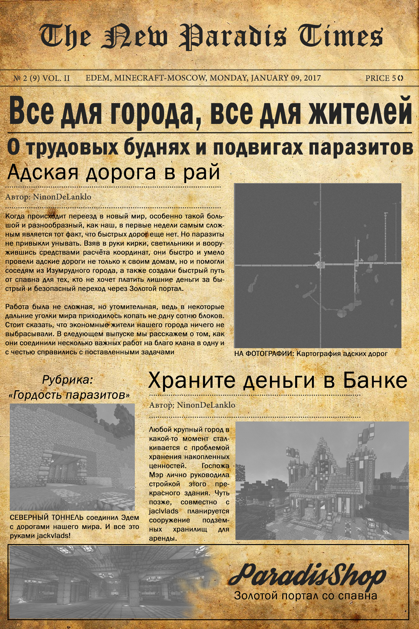 Доброго времени суток наши постоянные читатели городского еженедельника «Время Рождества в Парадизе» ! С Вами снова я, Мот69 Бейлиш (Мизинец) пройдусь по статейкам пергаментного свитка, лишь отчасти напоминающего цивильное издание, достойного столь прекрасного, во всех смыслах, нашего Города ! За свою честную и принципиальную позицию в отражении реальной жизни в «Раю», я был изгнан из редакции с «волчьим билетом»… Но, к счастью, есть ещё новостные ресурсы, (в т.ч. и "Герольды") на которых Вы сможете найти информацию об истинном положение дел, не подверженных цензуре и тщательному анализу со стороны Мэрии. По уже сложившейся традиции сразу опускаем громкие лозунги и призывы администрации пахать, не разгибая спины во имя светлого будущего и приступаем непосредственно к ознакомлению с содержимым… *** Адские врата в Рай. Вы, как и я, собственно, нисколько не удивлены появлению этой бесплатной «трассы», ведущей от СпавноГрада к Эдему - слухи о скупости чрезмерной экономности жителей Парадиза не лишены оснований, что в прочем, в очередной раз и подтвердилось… Не желая тратить несчастный полтинник на безопасную телепортацию через Золотой Портал, они добрую половину рождественских каникул пропадали в Аду, прокладывая себе бесплатную дорогу в Рай, обосновывая это чрезмерной дороговизной и недопустимым расточительством и что наиболее возмутительно - прикрываясь заботой о бюджетах покупателей, посещающих ПарадизШоп. Более того, дабы заполучить добрососедские партнёрские отношения с соседями («Волшебниками Изумрудного Города») и превратить их в постоянных покупателей своей продукции (в частности зелёной краски, в избытке имеюшейся на складах, благодаря ферме кактусов), паразиты рассчитали им правильное местонахождение «Адских врат» и с удовольствием помогли воздвигнуть и благоустроить их, проложив тоннель севернее jackvlads . Но не только это тревожило воспалённые от шампанского и оливье денег мозги Правителей Эдема… *** Банк. Вторую половину недели, едва приподняв голову из тазика с салатом, руководство отправляло выживших после новогодних корпоративов паразитов на строительство финансового учреждения, потому как колоссальные денежные потоки, полноводной и бурлящей рекой хлынувшие в Эдем требовали своего грамотного размещения. Поднятые из под столов Таверны, подобранные вдоль дорог, лежащие и обессиленные Райчане, под руководством Мэрши с кнутом и пряником, вновь и вновь приступали к работе… По задумке руководства «Паразит-Инвест» будет оказывать весь спектр банковских услуг: 1. Размещение материальных ценностей в банковских ячейках (путем выделения сабзоны, в соответствии затребованной клиентом размером). 2. Привлечение финансов - как собственных, так и внешних, под гарантии Уставного капитала, исчисляющегося многомилионными, не укладывающимся в голове цифрами. 3. Выдача кредитов под баснословные проценты и гарантии не менее трёх поручителей, а также твердого залога в драгоценных камнях. Шикарный интерьер и удобное расположение (в нескольких шагах от Городского Портала, и вновь введённого в эксплуатацию – Адского), по заверениям Правителей, без сомнения привлечёт многочисленных клиентов. *** Тем не менее в Парадизе оставалось множество нерешённых социальных проблем, которые Мэрия Города отодвигало всё дальше и дальше н