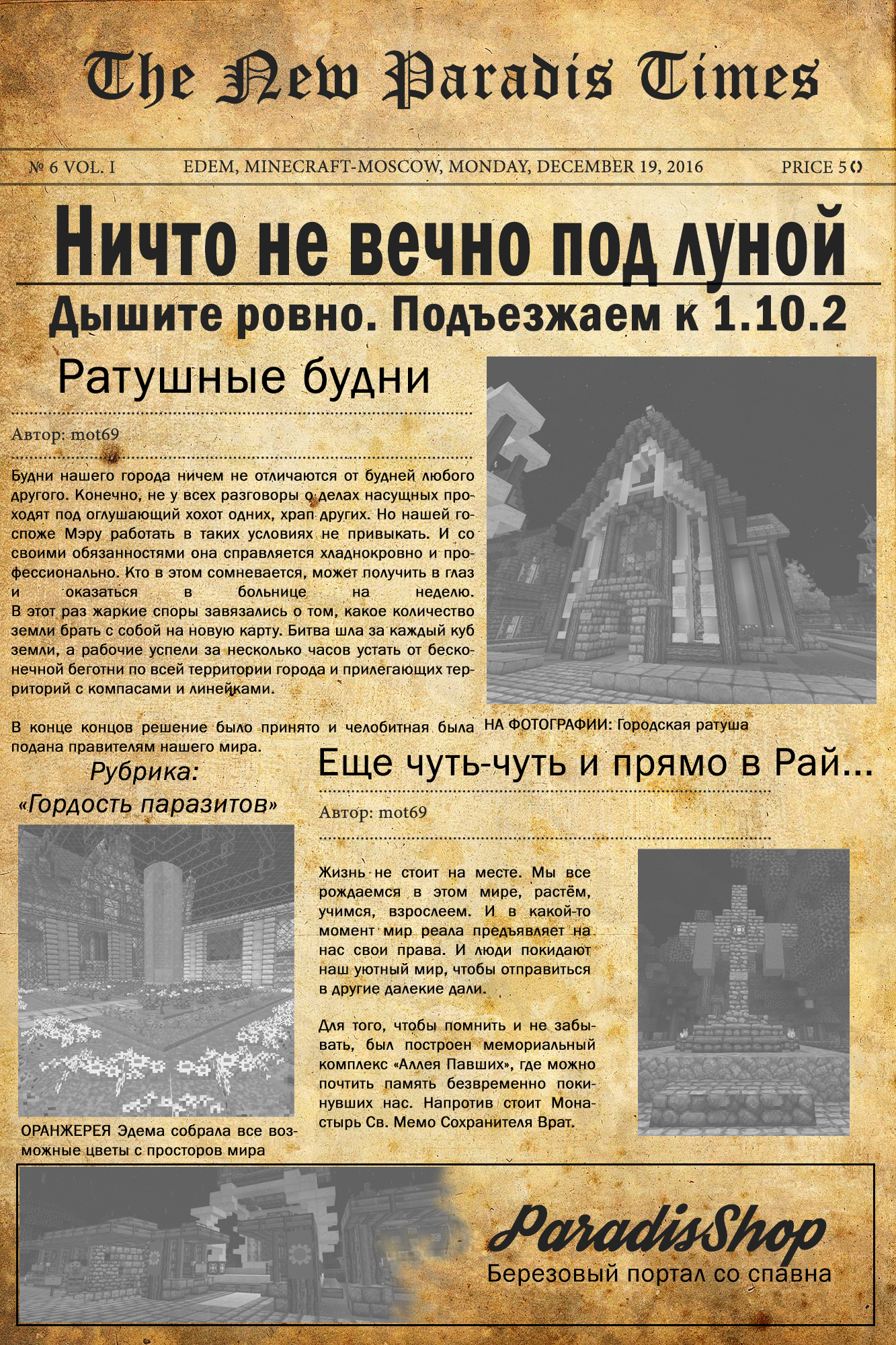 Доброго времени суток глубокоуважаемые читатели нашего Еженедельника «Паразиты в Новом Времени» ! С Вами снова я, Мот69 (волею Nappsel - опять Архитектор-Мизинец) –попытаюсь разобрать неразборчивый текст и размытые картинки в свежем выпуске нашего издания. На банальные заголовки/подзаголовки мудрые жители уже давным давно махнули рукой - поэтому идём дальше... *** Первая статья посвящена тому, как Правители Эдема чуть не развалили Ратушу, дискутируя в её стенах о размере территории, которой, предположительно, должно хватить для воплощения всех идей, намеченных на наступающий год, оправляясь снова и снова на угловые точки с рулетками и компасом, чтобы ещё раз удостоверится: «А не мало ли мы захапали»? В ход шло всё: доносы на «пропавших» соседей, принуждение к согласию включить свой приват в состав «Нового Парадиза» лояльных и не совсем к Городу игроков, другие непопулярные в народе меры… Запас сейсмостойкости, изначально заложенный в конструкцию Ратуши, выдерживал даже самые жаркие дебаты, лишь храп Джека, («ушатанного» после противопожарной тренировки, проведённой по инициативе Мэрши, с целью недопущения возгорания зданий и сооружений после переноса), вызывал легкое дребезжание стёкол… Соглашение было достигнуто лишь тогда, когда ввиду критических нагрузок на здание было решено прервать заседание, эвакуировать пострадавших в результате дискуссии и отправить соответствующее решение Правителей в тему на форуме. Признание администрацией «эталонности» заявки (ввиду отсутствия каких-либо недочётов) дало нам понять, что всё это было не зря ! На радостях все уцелевшие при обсуждении размеров привата «Эдем – 1.10.2» выползли собрать цветы из Оранжереи и возложить их к могилам «почивших в бозе» горожан и горожанок, покинувших нас на протяжении уходящего года. Собрав пышные охапки ярких разноцветий и наплетя венков на скорую руку, траурная процессия медленно двинулась в сторону погоста…. *** Помним, любим, скорбим…. Наш путь пролегал на другую (юго-западную) часть города, через мост реки-Паразитки… Дорогу на кладбище преграждал Монастырь, где богобоязненные горожане замаливали многочисленные грехи, ставили свечки за упокой «канувших в бездну» реала, а так же за здравие администрации ММ. Монастырь был воздвигнут в честь Св.Мемо - Сохранителя Врат. В одной из келий мне в нос ударил тонкий волшебный аромат любимых духов Zabaava , отбывавшей здесь Епитимью в начале лета. Также в её комнатке сохранился пакетик с хной, благодаря которому они с Мэршей превращались в «Рыжих Бестий» и тем самым шокировали немногочисленных прихожан своей яркой шевелюрой, неприкрытой ничем (как это подобает скромным послушницам) в Святом месте. Местного попа-расстриги (по совместительству председателя колхоза «Красный Паразит») на месте не оказалось, поэтому путники, совершив необходимые обряды в Монастыре и выходя из него на просторы местного могильника были слегка удивлены появлением новых крестов на его территории. Ходили слухи, что на бескрайних просторах «Райского кладбища» можно похоронить кого угодно, заплатив соответствующую мзду охраннику (в чем недавно был уличён один из жителей Города), но количество крестов строго соответствовало количеству записей в реестре погребённых. Мы не будем перечислять всех имён, которые по разным обстоятельствам, на 