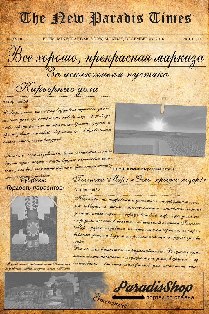 Доброго времени суток глубокоуважаемые читатели нашего Городского издания «Рай в новой Версии Реальности » ! С Вами снова я, Мот69 Бейлиш (Мизинец) – ввиду отсутствия типографии, с напечатанной «на коленке» газетой - соответственно неразличимым шрифтом и нарисованными от руки картинками, попытаюсь презентовать Вам свежий выпуск нашего еженедельника. В шапке, как и всегда, заголовки, которые только пускают угольную пыль в глаза, потому мы их игнорим и читаем дальше… *** Райский карьер. Первую половину прошедшей недели горожане, оставшись без крыши над головой и средств к существованию (ввиду переноса Города на новую карту) словно одичалые, набросились с каменными кирками (более дорогие инструменты были успешно транспортированы в крупах ничего не подозревающих осликов) на срез, оставшийся после «выемки» Эдема. Как видно из размытой картинки, в дело пошли даже Големы, которых голые Райчане (броня была отправлена тем же, вышеуказанным способом) таскали за собой, чтобы обеспечить безопасность своих «тылов» от нечисти, расплодившейся на бескрайних просторах карьера. Наблюдавшая свысока за этими гнусными бесчинствами, Мэрша Города, вскоре махнув рукой (и следуя пословице: «Если не можешь запретить – значит возглавь и организуй!») - плюхнулась в заботливо приготовленную подчинёнными лужу, и, благодаря опыту руководящей работы - выбилась в передовики по добыче ресурсов в категории "на открытом полигоне" ! В этом возмутительном налёте на беззащитные пласты железа, угля и других более-менее ценных ресурсов, находящихся в открытом доступе, открылись все низменные пороки, присущие жителям нашего славного Города (совершенно заслуженно наречёнными в народе «паразитами»)…. ***Райский плащ. Но, к счастью, не у всех горожан и близких друзей Парадиза мысли в это непростое время работали только в материальном направлении. В одной из художественной мастерской, находящейся вне территории Города, был создан образец плаща, и впоследствии - щита, которые были рекомендованы к «употреблению» на версии 1.10. ***Райские погорельцы. Как Вы уже догадались из заголовка, речь пойдёт о беспрецедентном разгильдяйстве руководителей, халатному (если не сказать преступному) отношению к выполнению своих должностных обязанностей при подготовке зданий и сооружений Города к предстоящему переносу. Реальность и масштабы катастрофы настолько велики, что я просто вынужден убрать фото под спойлер, чтобы не травмировать Вас увиденным… Спойлер: Апокалипсис… (18+) Всё, что было дорого мне и многим участникам оргий культурных мероприятий (см. последнее фото), проводимых под эгидой «Чистый четверг» было безжалостно уничтожено огнём (только подкопчённые пожаром тазики вёдра и обугленные дубовые веники напоминали мне о тех «райских мгновениях», проведённых здесь в уходящем году.) И если бы не чёткие, слаженно-оперативные действия Администрации по предотвращению распространения огненной стихии – жители Эдема шагнули бы в пятницу на пепелище ! Убытки, понесённые в результате пожарищ, вряд ли смогут быть компенсированы из изрядно похудевшей в результате переноса казны, а значит мне, как и прежде, придётся назойливо докучать достопочтимым гражданам ММ с просьбами поделиться хоть чем-то, что сможет помочь восстановлению Эдема… (К моменту выхода этого номера в свет я уже бы