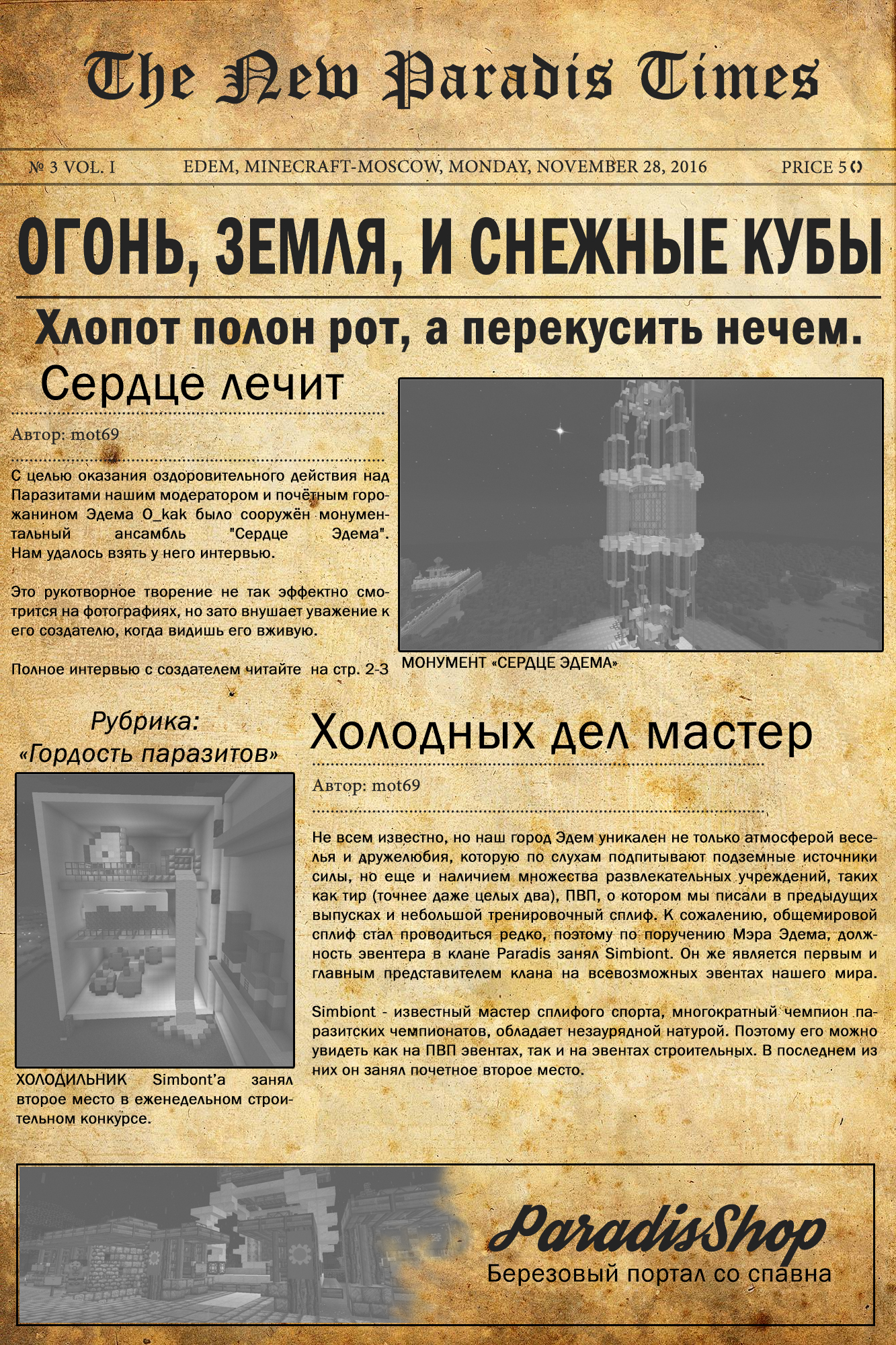 Доброго времени суток Дамы и Господа ! Я, Мот69 Бейлиш (Мизинец), рад очередной встрече с Вами, и готов представить третий выпуск «Нью-Райских Новостей» (судя по амбре и состоянию газеты похоже на то, что Джек в ней опять контрабандировал шпроты из Прибалтики в Москву). Попытаемся разглядеть хоть что-нибудь… Как и всегда в шапке издания мы наблюдаем постулаты, которые отвлекают горожан от истинного положения дел в Эдеме (об этом мы сейчас и поговорим). Первая статья повествует нам о возведении на территории Города СанАторно-курортного комплекса «Сердце Эдема» для якобы оздоровления «Паразитов» сами не знаем от чего… При ближайшем рассмотрении мы и вправду можем заметить, что от него так и веет «Здоровьем»! Но на самом деле в этом монументальном эпике мне удалось обнаружить «второе дно». Через Тайного Агента (они у меня повсюду), которому удалось тет-а-тет побеседовать с Создателем «Сердца», вдруг неожиданно всплыло настоящее назначение этого сооружения (для тех, кто не разглядел заметку сквозь жирное пятно на газете – приведу текстовую версию переписки): Тайный Агент: «Что сподвигло Вас на создание столь эпичного шедевра?» О_как: «Желание взять под контроль ту магическую энергию, которой обладает Эдем. Таким образом появилась возможность избежать многих проблем, связанных с ней и её воплощениями. Тайный Агент: «Удались ли Ваши замыслы?» О_как: «Частично. Для полного контроля нужно завершить руническую печать вокруг. А пока что энергия продолжает просачиваться сквозь барьер. Так что не советую без особой нужды находится рядом, по крайней мере без меня.» Как Вам это??? Контроль над энергией жителей !!! (мало нам лютой Мэрши, так ещё и злобный Модер подключился !) Представляю себе последствия после ввода в эксплуатацию данного объекта на полную мощность… Если вы увидите меня в игре мирно копающим шахту, а не слезливо просящего приюта и каких-нибудь мещанских ценностей – знайте, что «Сердце Эдема» заработало ! *** Более половины прошедшей недели мы занимались поисками шерсти, пропавшей с Портового склада. Но благодаря бдительному соседу (который был крайне возмущён созданием вблизи его границ «Мохерового кубоида») выяснилось, что оказывается один из Паразитов участников клана Simbiont решил таким образом поучаствовать в еженедельном строительном конкурсе. И если бы не занятое им призовое место и не 50к (которые горожане радостно прокутили в Таверне) – ему пришлось бы несладко… К сожалению я немного припоздал к оценке этого «Кашемирового Чуда» соклановцами и поэтому моему взору открылась следующая картина… Мне также удалось установить причину возведения этого агрегата, побывав на основном месте работы нашего «Морозко», и выяснить причину любви ко всему, источающему холод. Неоднократный победитель Сплиф-турниров и возглавляющий данное направление в Эдеме оказался замороженным не слишком разговорчивым индивидуумом, но то, с какой любовью он отдаётся своей работе - заслуживает уважения. Райский Сплиф – одно из самых грандиозных культурно-развлекательных сооружений Эдема, уже полюбившиеся многим игрокам нашего Проекта (сам неоднократно проваливался сквозь толщу снега в леденящую бездну воды). Масштабы этого строения позволяют одновременно и в полной мере насладиться соревнованием практически всем желающим «копателям» (коих у 