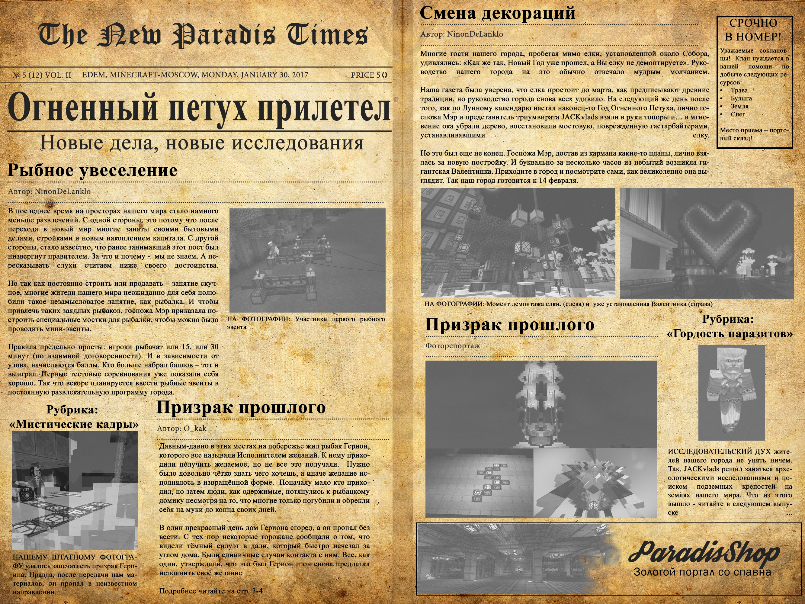 Доброго времени суток наши дорогие, безо всякого сомнения, читатели городского еженедельника «Новый Эдем Тайм» ! С Вами снова Мот69 Бейлиш (Мизинец) – с удовольствием поведаю Вам новости, произошедшие на очередной, уходящей в историю неделе. *** Диво-дивное ! В связи с затянувшимися праздниками, у Руководства никак не доходили руки демонтировать новогоднюю ёлку, напоминавшую им о том счастливом времени, которое именуется в народе «Рождественскими каникулами» !. И только когда уже прошли все сроки, и даже жители «Поднебесной» успели отметить приход Красного Петуха - над зелёной красавицей взметнулись топоры… Снеговички, до этого беззаботно плавающие в окрестностях, поспешили эмигрировать на Север, оставляя за собой белый холодный след… Но не успела бригада демонтажников сложить ёлочные украшения в коробку сундук, как вдруг лунное затмение сменилось яркой вспышкой, и на месте рождественского талисмана явилось «Нечто» ! Поначалу всем показалось, что это – проекция/голограмма, но подойдя поближе все почувствовали жар, исходящий от этого «Объекта». Многие уже даже догадались откуда «растут ноги» у этого чуда, поэтому было решено найти «Злобного Модератора» и истребовать у него объяснений… *** Легенда о Сердце. Всю неделю O_kak бегал по городу как сумасшедший, с книгой, обмотанной медальоном. Проще было остановить «Паразитский Экспресс» на полном ходу, чем его. Ближе к концу недели мы всё же смогли его разыскать на набережной Эдема, неподалёку от банка. Он, как ни в чём не бывало, копошился в культурно огороженной яме. Как оказалось, это был обвал подземного тоннеля, о котором мы даже и не подозревали... Вглубь мы так и не попали, но зато получили ответы на несколько давно интересующих весь Город вопросов, в виде любопытной легенды (которая чудным образом затерялась на книжных полках)…. Вот что он нам поведал: «Давным-давно в этих местах на побережье жил был рыбак Герион, которого все называли Исполнителем желаний. К нему приходили просящие, но не всем удавалось получить желаемое. Нужно было довольно чётко знать чего хочешь, а иначе желание исполнялось в извращённой форме. Поначалу мало кто приходил, но затем люди, как одержимые, потянулись к рыбацкому домику несмотря на то, что многие уже погубили себя или обрекли на муки до конца своих дней… В один прекрасный день дом Гериона сгорел, а сам он - пропал без вести. С тех пор некоторые горожане сообщали о том, что видели тёмный силуэт вдали, который быстро исчезал. Были единичные случаи контакта с ним. Все, как один, утверждали, что это был рыбак, и он якобы снова предлагал исполнить свои самые сокровенные желания». После столь завораживающего рассказа, нам удалось узнать, что легенда оказалась правдой. Обнаруженная энергия была той самой, которую он использовал. Доказательством этому был теперь уже постоянно блуждающий возле Сердца Эдема призрак Гериона (теперь понятно, кто ошивался там - благо наши пути с ним не пересеклись). Но самое интересное нас ждало впереди. Эта энергия - всего лишь часть другой, более мощной, присутствие которой О_как ощущал в образовавшемся обвале. В связи с ещё существующей связью между обоими сгустками, он предложил два пути решения сложившейся ситуации по нахождению основного источника: • Восстановить полноценную связь. В этом случае появится возможность завла